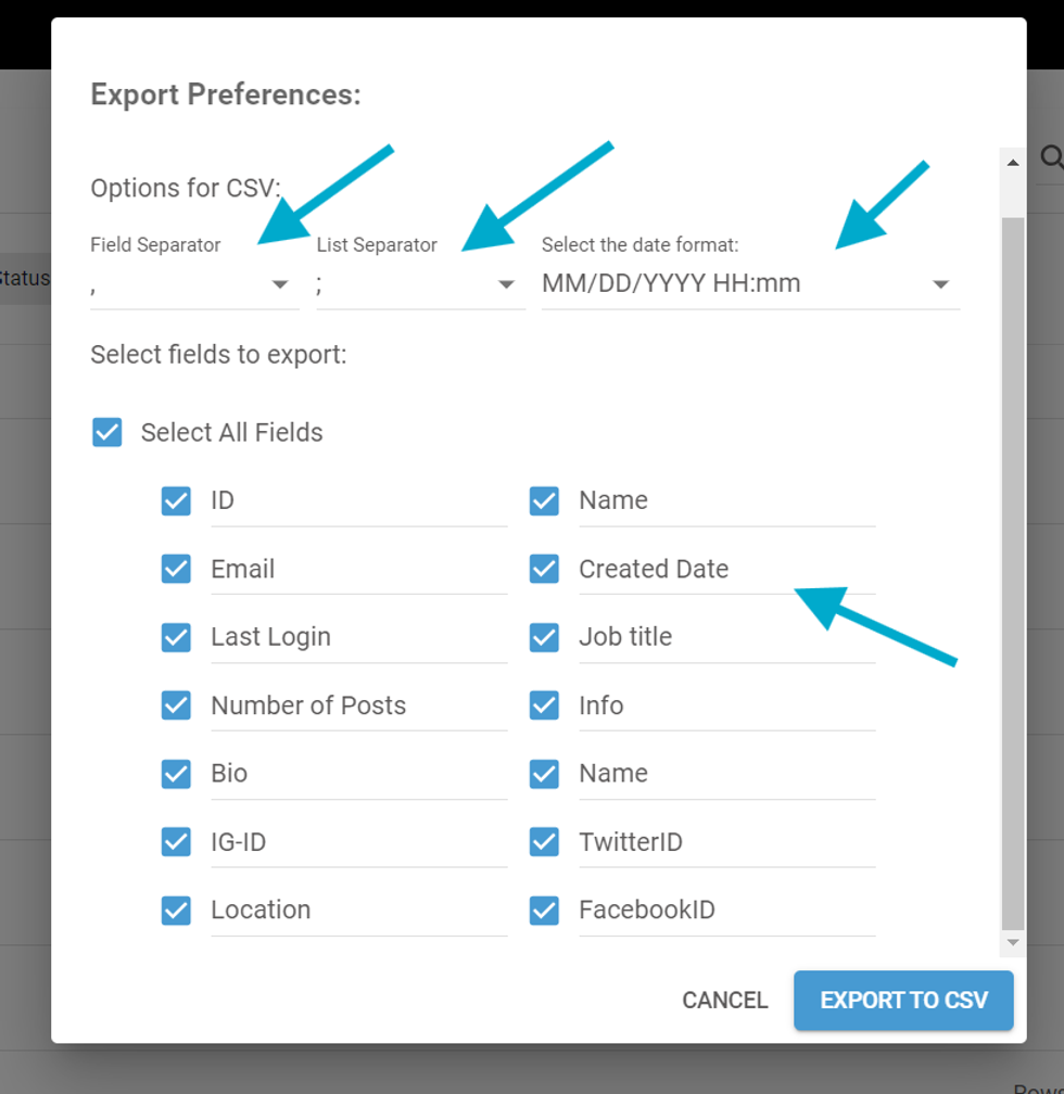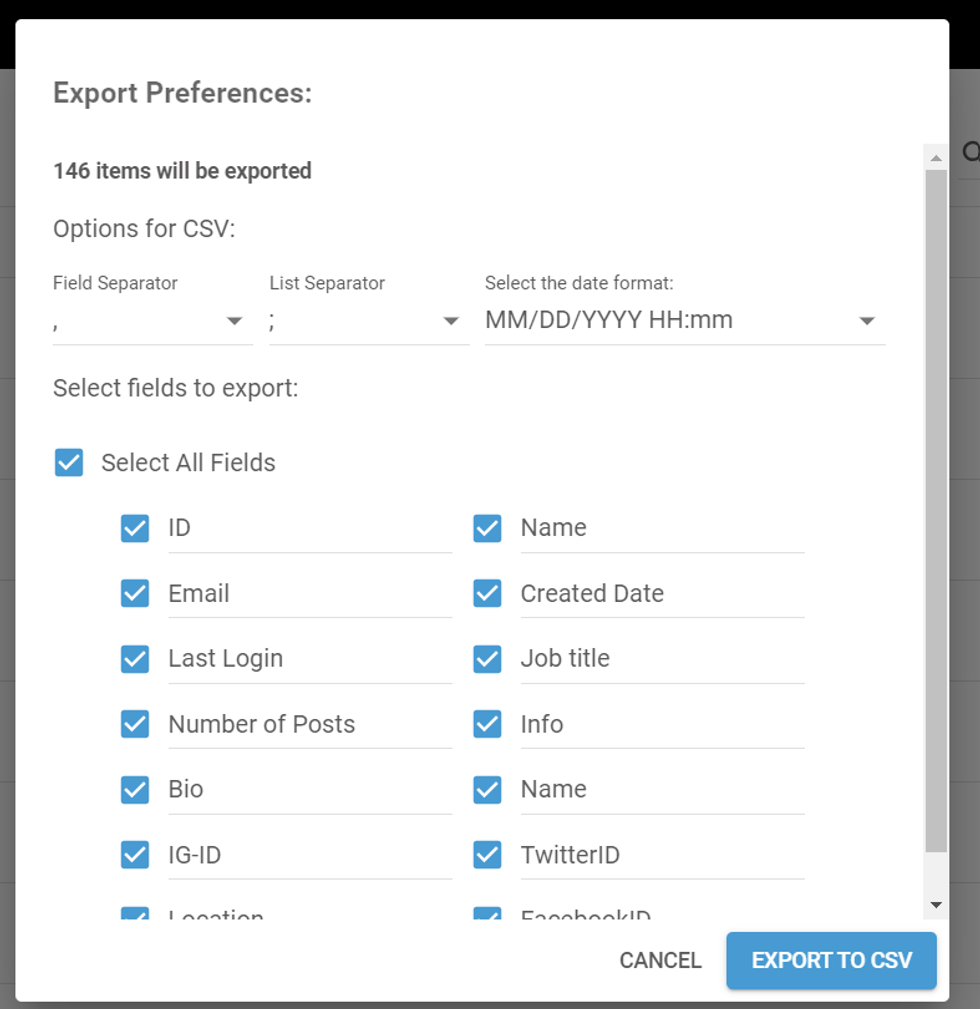Once you've customized all your export preferences and selected the desired fields, simply click on the "Export to CSV" button to initiate the process. The file will be downloaded. If you change your mind, you can always click the "Cancel" button to abort the export.