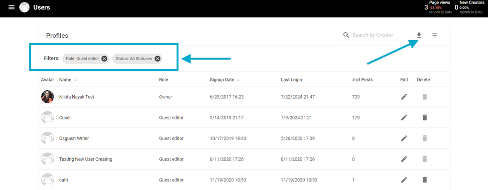 The user dashboard provides powerful filtering options, allowing you to narrow down users based on specific criteria. Once you've applied the desired filters, you can export the filtered user data into a CSV format. This allows you to combine both filtering and exporting features, enabling you to efficiently manage and analyze the exact user data you need.