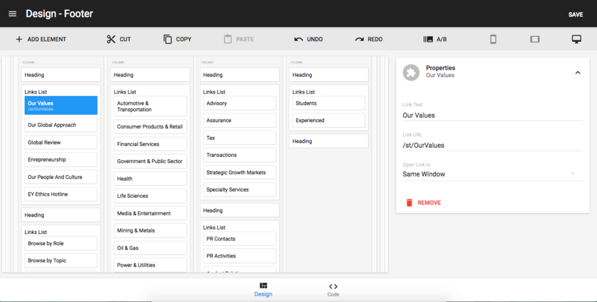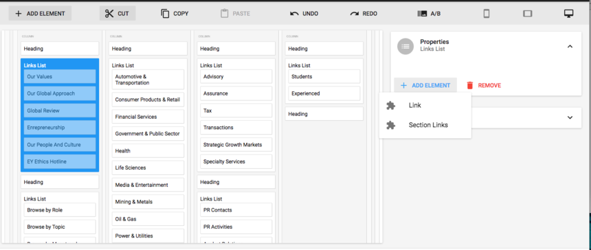 You can set up your Footer Links in the RebelMouse platform by going to your Footer Page, click on + Add Element and choose Links List: