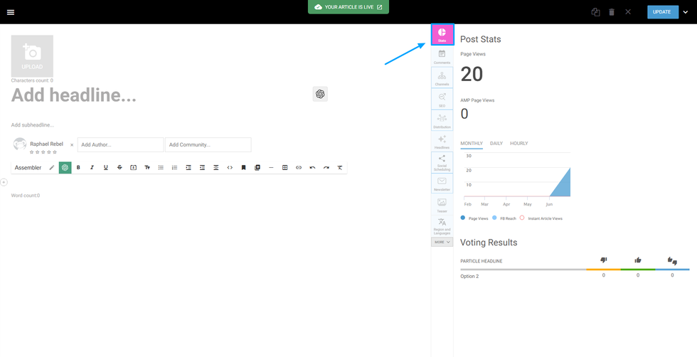 To offer a dynamic view of the analytics of your post, we have a Stats tab on Entry Editor. This tab shows some crucial stats of your post.