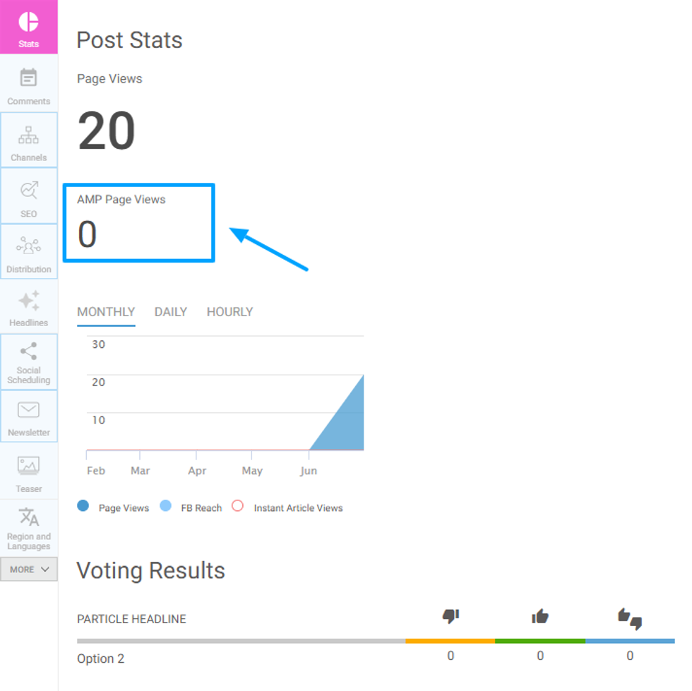 Shows a graph of the total page views, as well as Facebook views (distributed by FB Instant Articles views and Facebook reach) within the last 30 days, 24 hours, or the last hour, depending on what you select.