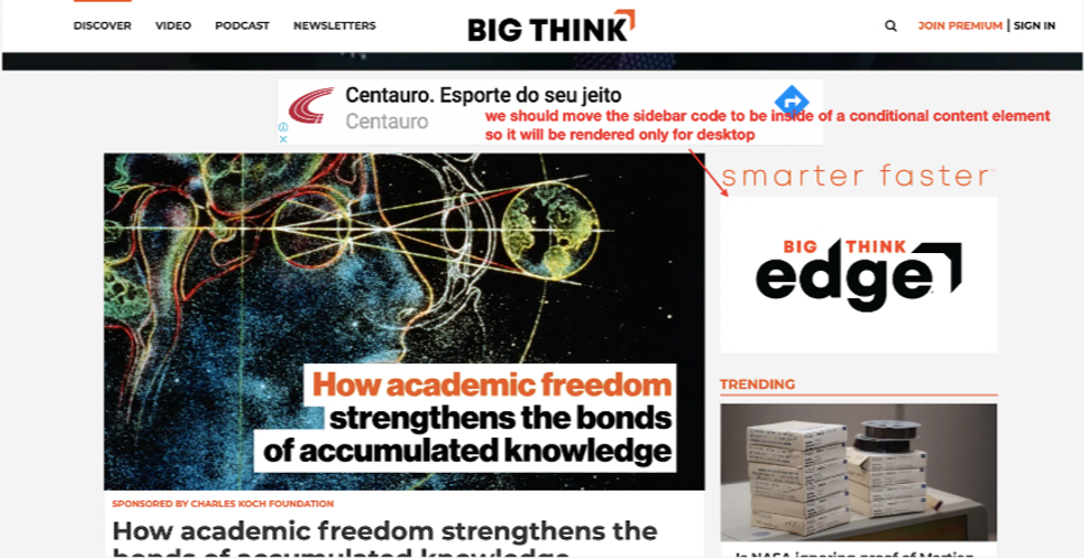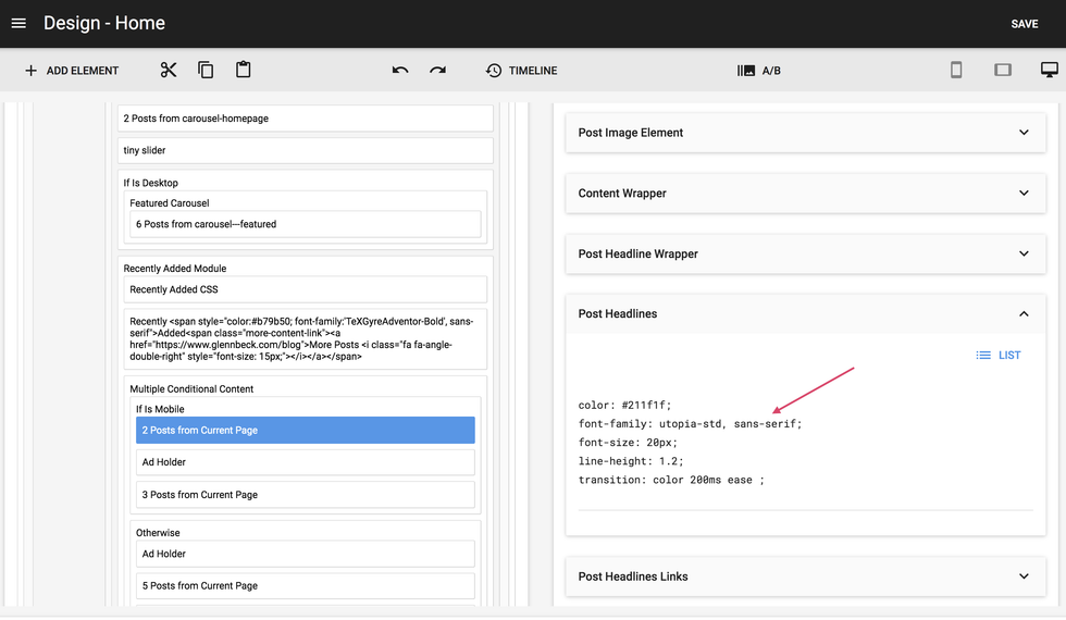 1. Conditional Content: If you're using an element for a specific solution, make sure you use a Conditional Content element. For example, if you have something that should only appear for desktop users, make sure to add a Conditional Content element and set it up so that the code only renders on desktop. The following is just one example of where we did this and immediately saw an improvement of five points in page speed.