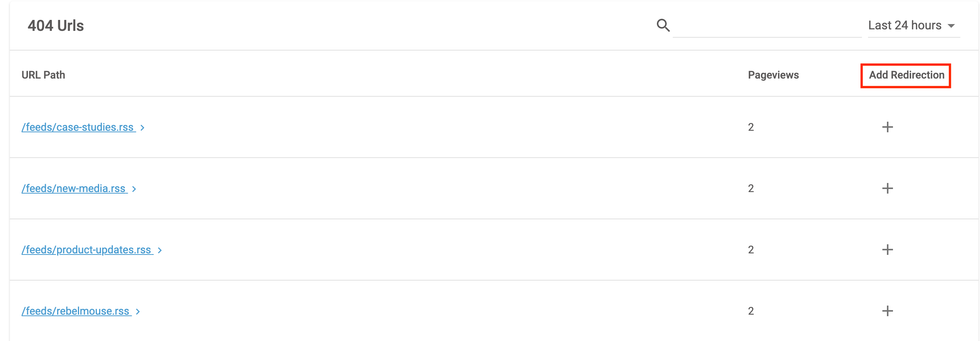 To set up a redirect for a 404 page, click Add Redirection in the top-right corner of the 404 Dashboard: