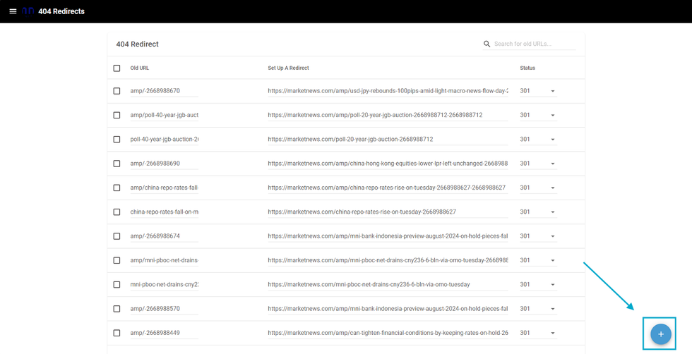 To add a new redirect on the 404 Redirects Dashboard, you need to click on the “+” button at the bottom right corner of the page