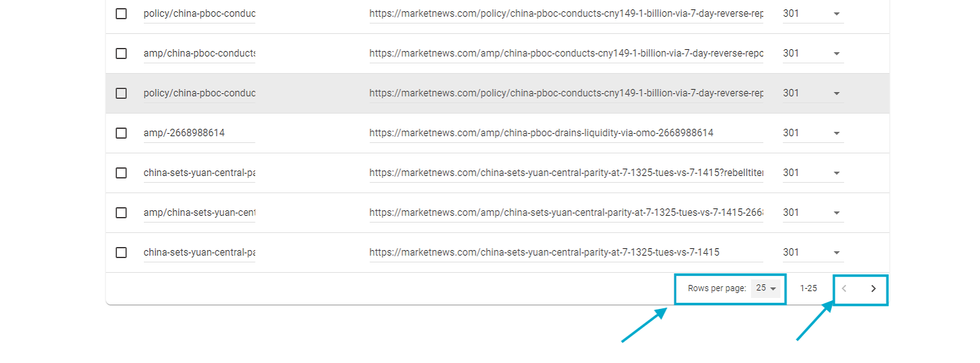 At the bottom of the table, you will find the Rows per page option. By default, it will be set at 25, but you can add other amounts by clicking the dropdown near the number.
