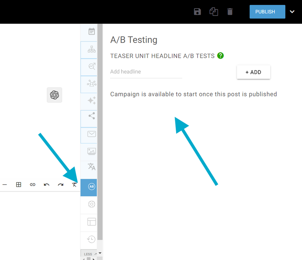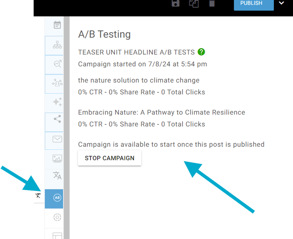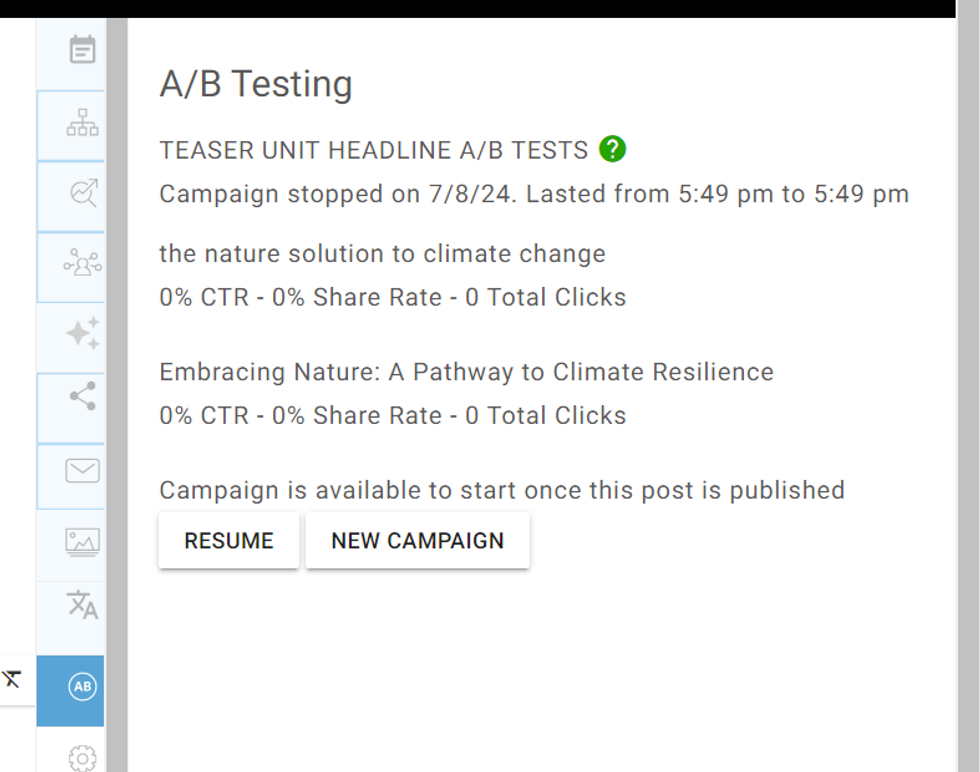 An '+ADD' icon that will make creating new headlines and campaigns a seamless experience for your editors and writers. Once you create new headlines and click on start campaign and you can start tracking each headline's performance. The CTR percentage rate shows how many times users clicked on the headline compared to how many viewed the headline (Clicks/Views) * 100 . The Share Rate percentage rate is calculated by how many times the article is shared with that particular headline.