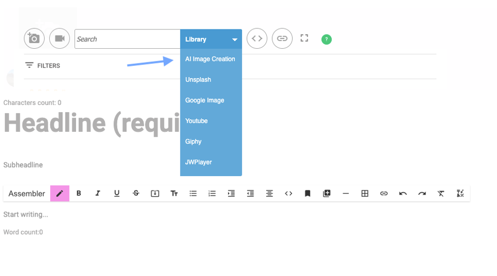 From Entry Editor, you simply need to open the Add Media Bar, select AI Image Creation, and then you can enter your search query.