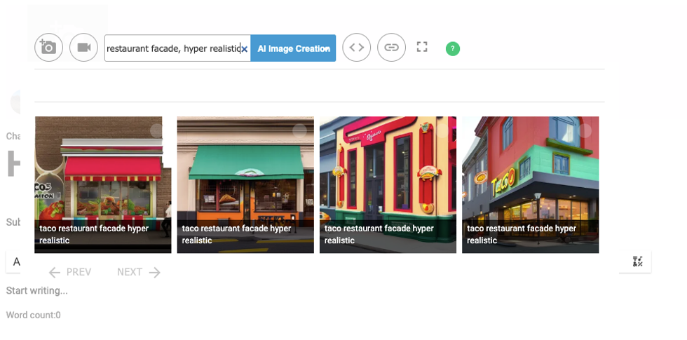 One thing to keep in mind is that this is not your typical image search! This integration allows you to generate unique images, of virtually anything you desire, in virtually any style that you wish. For instance, let’s say we’re writing an article about the best taco restaurants in Los Angeles. In a usual image search, we might use the search query “tacos” or “restaurant facade.” With AI image creation, we can search for something like “taco platter, oil painting.” And we receive results such as these: