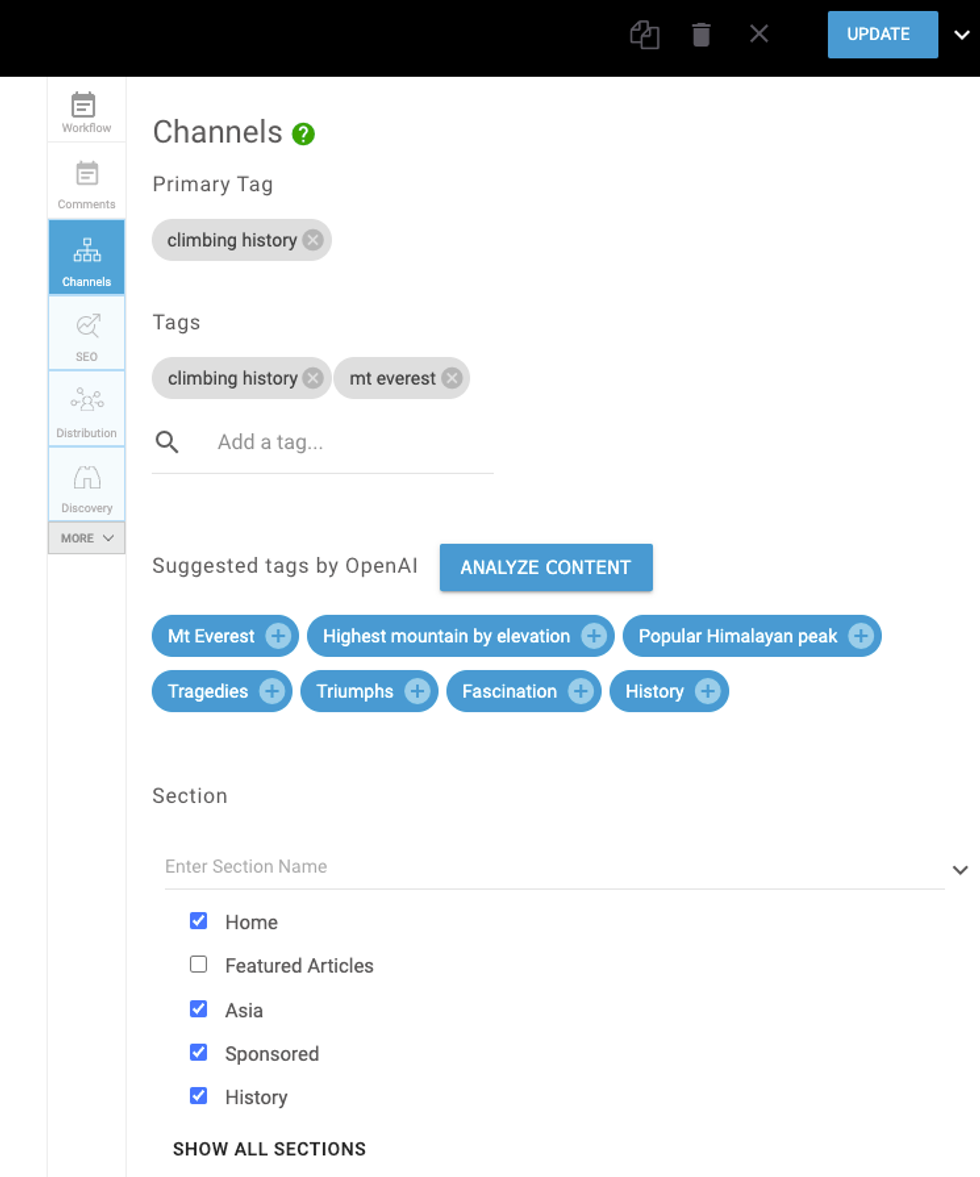 Once enabled, you’ll be able to very quickly have the AI analyze your article and provide suggested tags. As an example, let’s look at an article on my site that is about the history of Mt. Everest. In the Channels tab in the right-hand side bar, you can see that I’ve manually added the tags “climbing history” and “mt everest.”