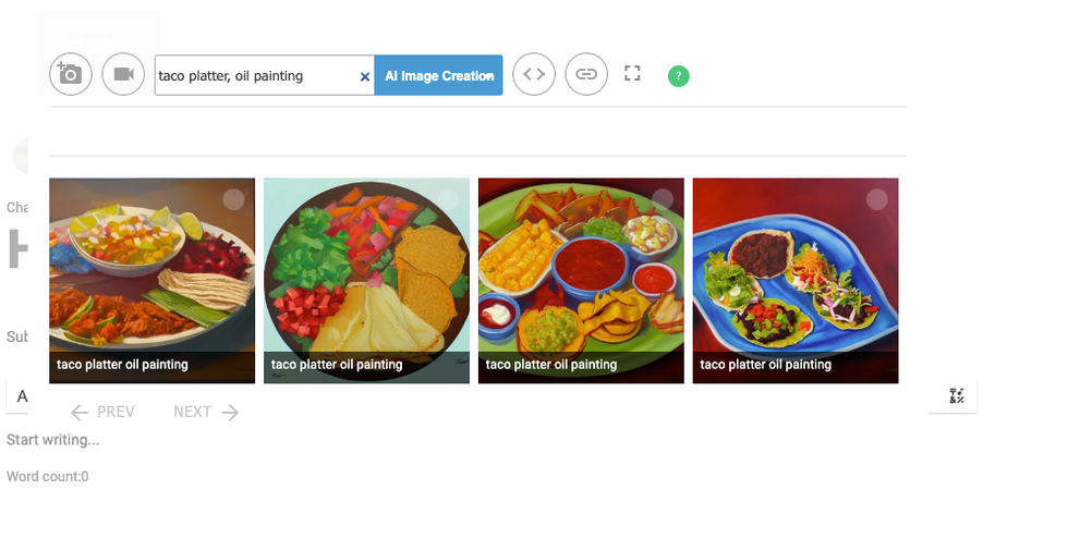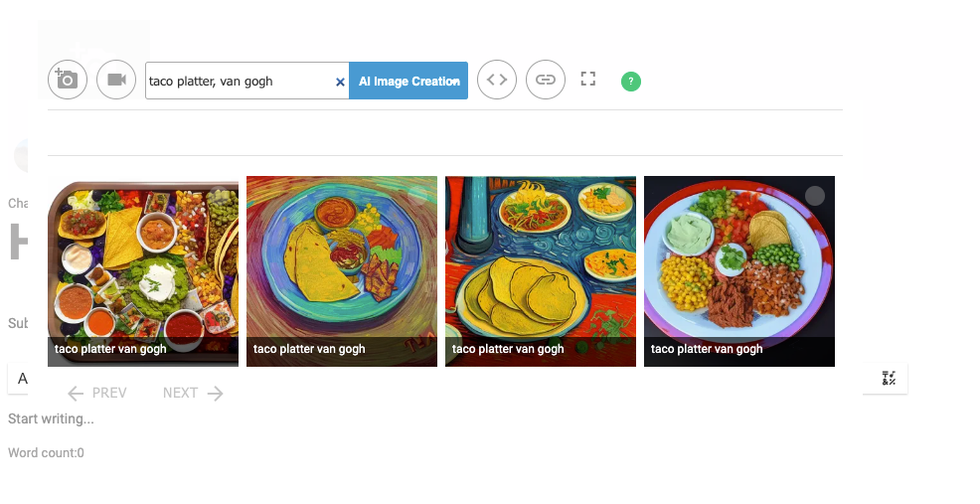 One thing to keep in mind is that this is not your typical image search! This integration allows you to generate unique images, of virtually anything you desire, in virtually any style that you wish. For instance, let’s say you’re writing an article about the best taco restaurants in Los Angeles. In a usual image search, you might use the search query “tacos” or “restaurant facade.” With AI image creation, you can search for something like “taco platter, oil painting” and receive results such as these: