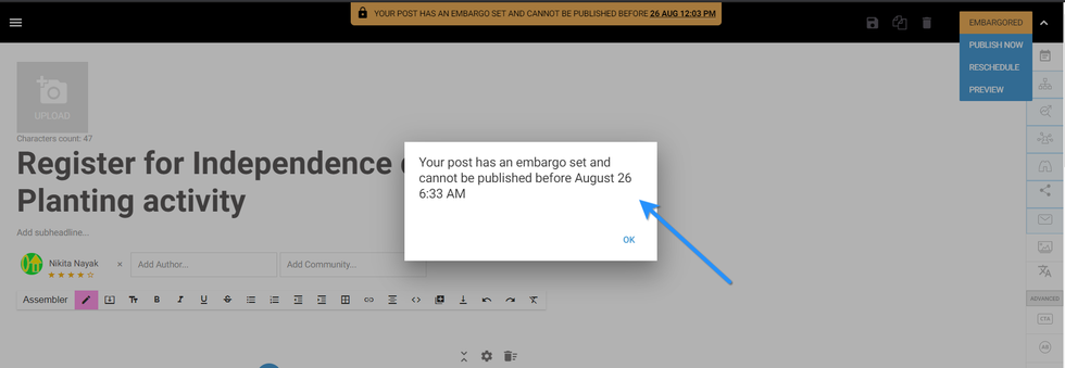 If anyone tries to publish an embargoed post, they will receive an error message: