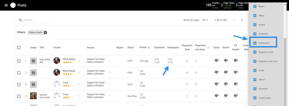 In the Posts Dashboard, you can also set an Embargoed column that will show each article's embargo date and time in your local time zone.