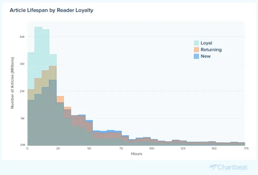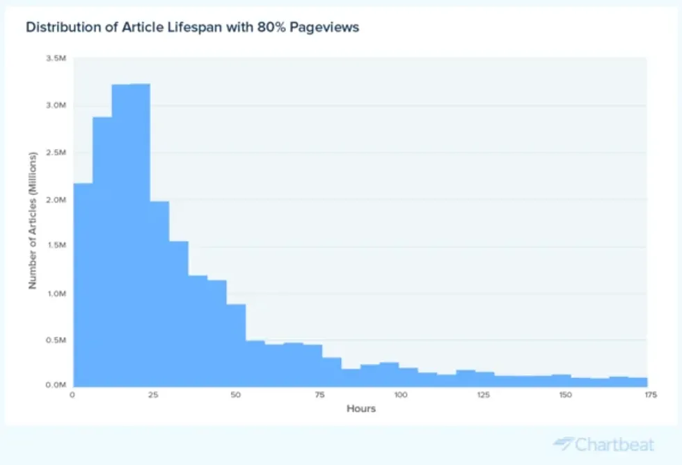 Drawing from our research on how the 80/20 Rule applies to pageviews and engagement, we are defining an article’s lifespan as the time it takes to reach 80% of its pageviews over the course of the first week after publication.