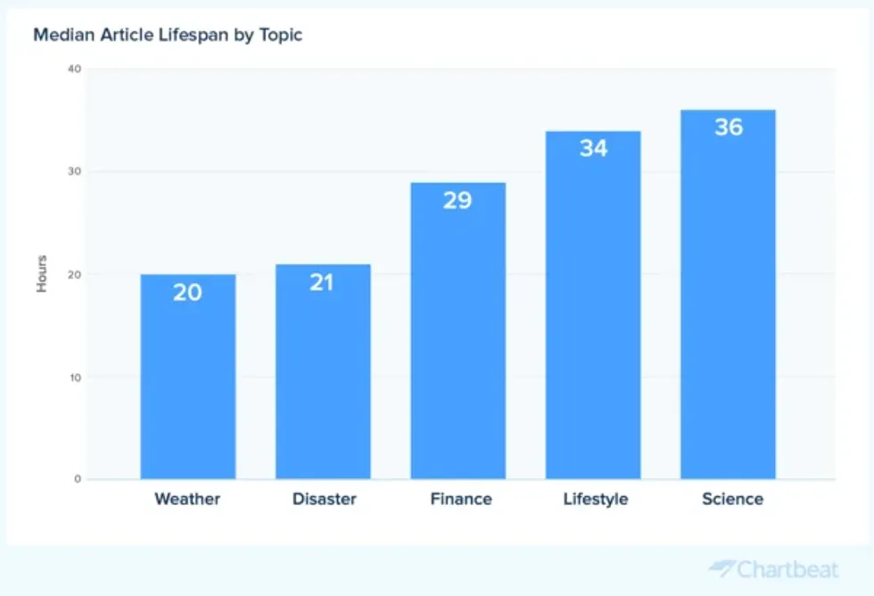 - Breaking news runs its course before lifestyle and science. While there may be some advantages to incorporating more articles on longer-lasting topics, it’s important to maintain the right editorial mix and not go all in on one strategy to chase readers.