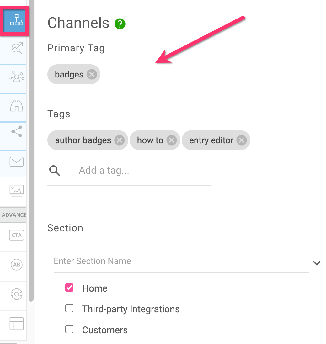 You can also add a badge to a post by adding the same tag that is associated with the badge in the Badges Dashboard. As a reminder, you can add tags via the Channels tab in the right-hand navigation menu of Entry Editor:
