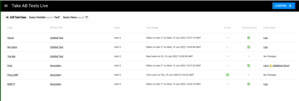 After a change is ready to be live, the developer can mark an A/B-Test as “Should go live?”