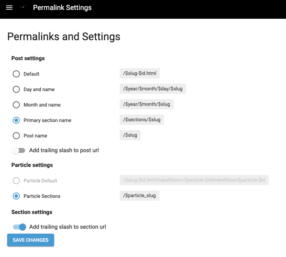 RebelMouse's Permalink Dashboard gives users the ability to change the URL structure of their articles and particles. Append r/dashboard/permalink_settings to your site's URL in your browser's address bar to quickly navigate to the dashboard.
