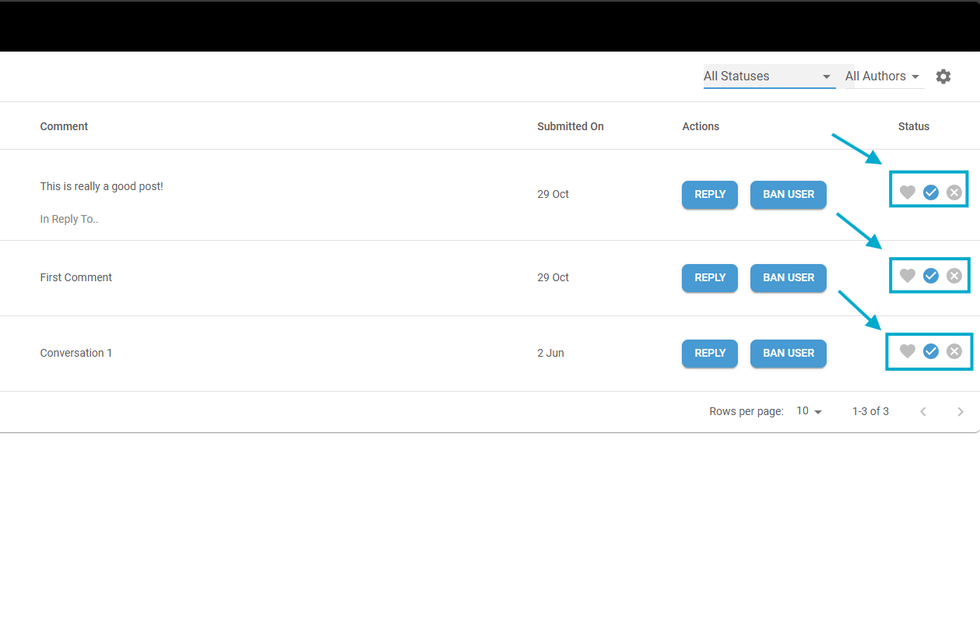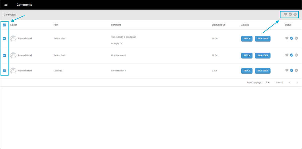 You can also bulk Check, X, or Heart comments in the dashboard. You can mark the checkbox in the left corner column to do it. After that, the bulk options will appear at the top right corner to be selected.