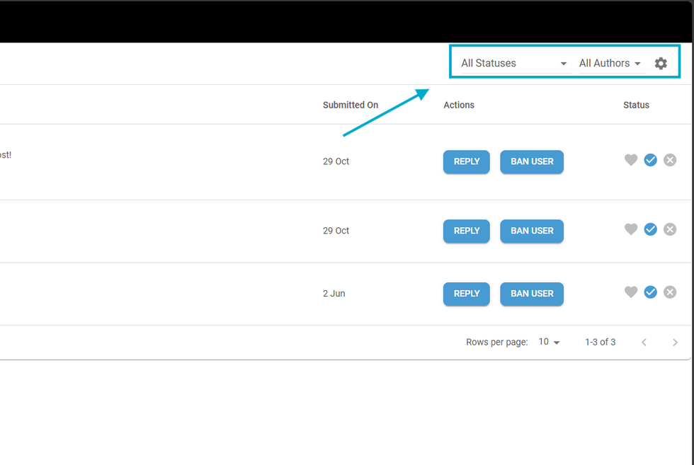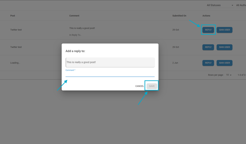 Any comment on the Comments Dashboard page will have the Reply button in the Actions column. Once clicked, a new pop-up will open allowing you to write a comment. After writing the comment, click on Save.