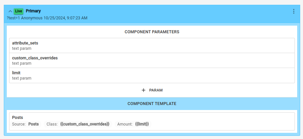 These are the customizable settings for each Component. Parameters make the Component flexible, allowing you to adjust anything you'd like without modifying the template itself. Examples might include text, links, CSS classes, post data sources, post counts (which we call attribute sets), and more.