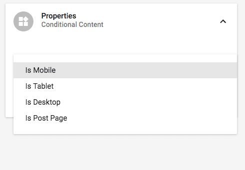In the drop-down menu of the Properties card, you can choose if you want the conditional content to be shown in mobile, tablet, or desktop views.