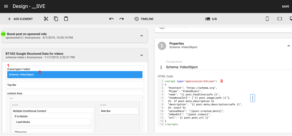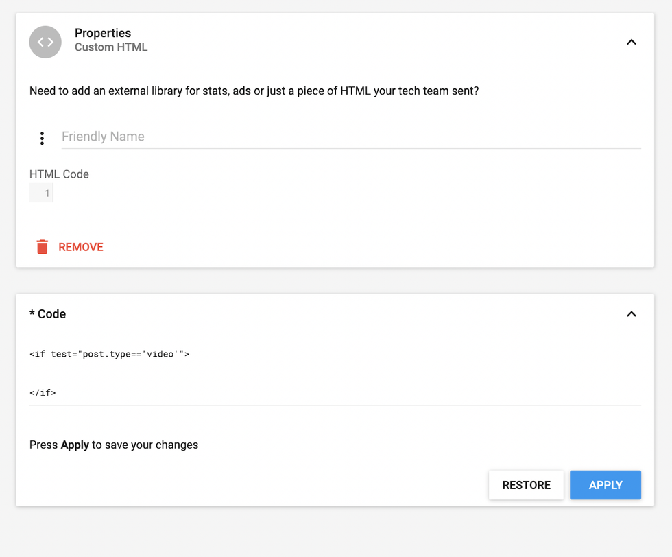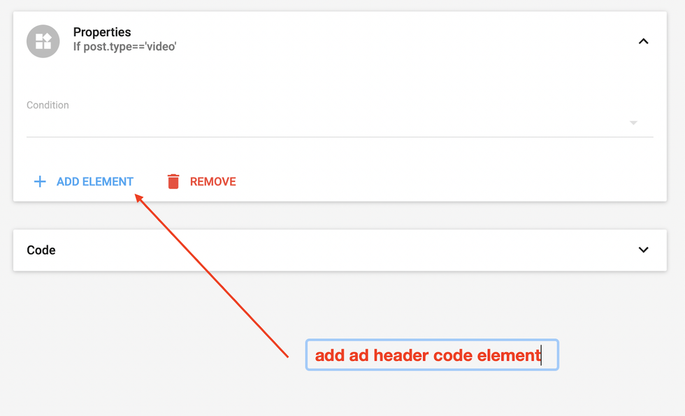 First, add a Conditional Content element that triggers when a post type equals video. Then, create a Custom HTML element and click into its Code card: