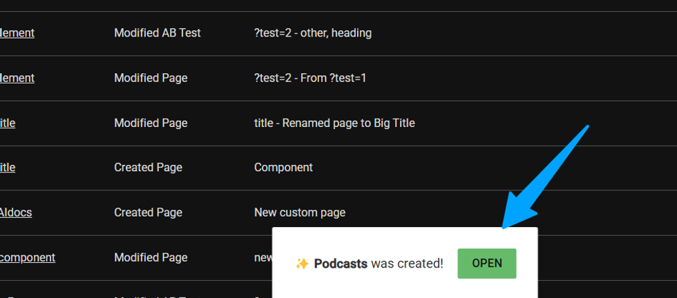 Step3: Click on Create, and you’ll receive a confirmation message indicating that your Custom Page has been successfully created at the bottom of the page. You can now simply click on Open to view and start editing your Custom Page.