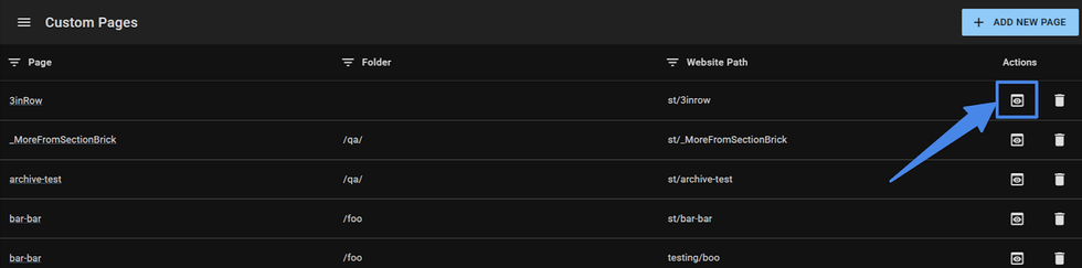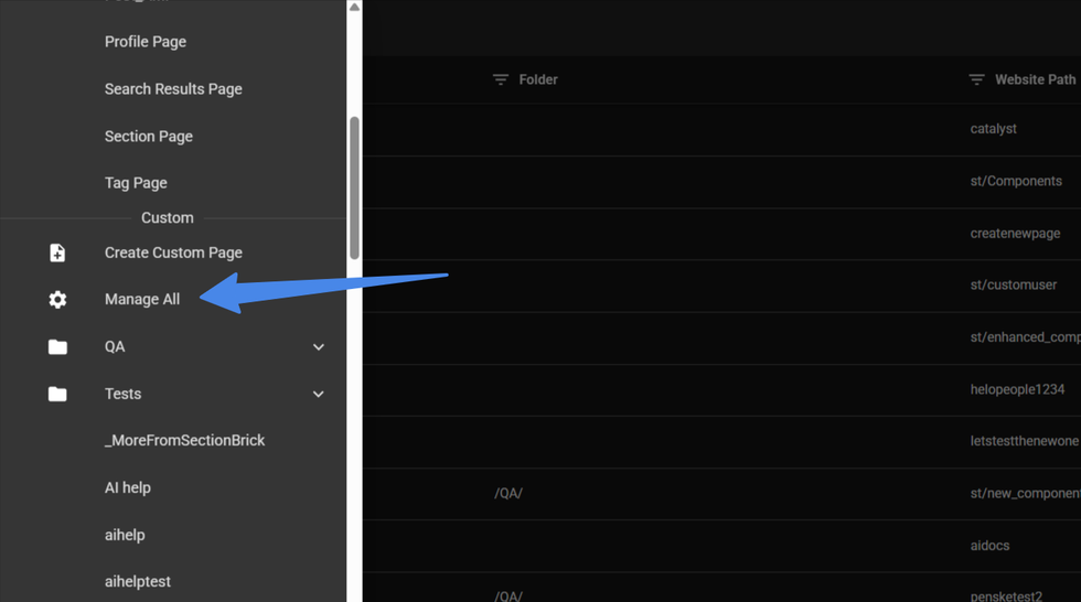 You can manage all your custom pages from the "Manage All" option on the sidebar menu (will add this as link r/layouts-editor/?#/custom-pages), here you will see a list of all the custom pages you’ve created.