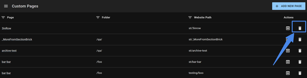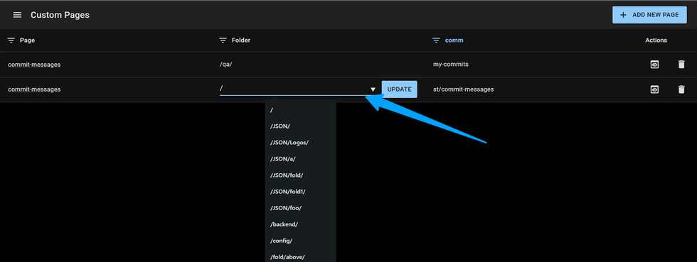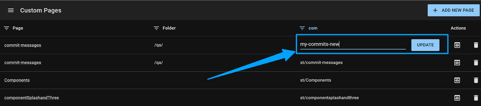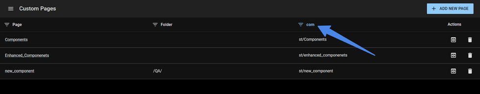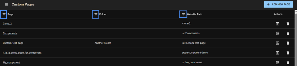 You can filter your custom pages by Name, Folder, and Path.