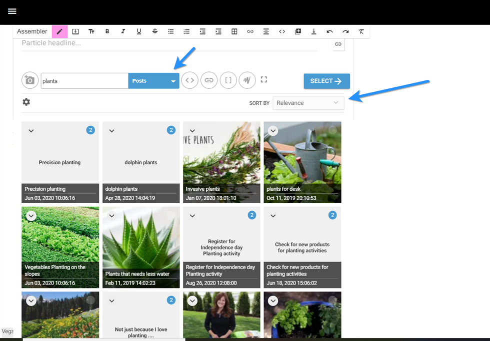 In both Assembler and the post body, you can sort related posts by relevance and age. Select your preference in the SORT BY drop-down menu underneath the SELECT button.
