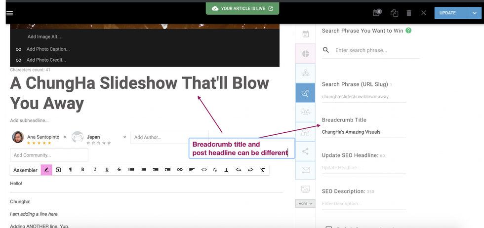 In Entry Editor, you can also control if you want the Post Title to be exposed in your breadcrumb trail, or if you'd rather have a customized title show up for it instead.