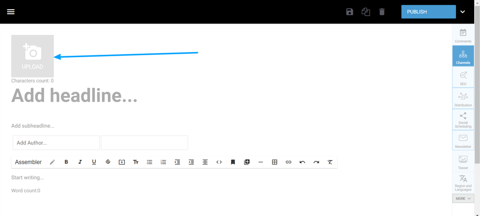 To add an image to your post’s header in the Entry Editor, you can click on the upload button and the Add Media Bar will appear. The Add Media Bar supports a variety of media types, and if you wish to upload an image from your computer you can click on the first photo icon on the far left. However, you can also select your image from a third-party such as Google Images or Unsplash. After uploading your image, you can edit it further using our Edit Media Tools.