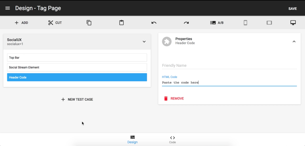 - Add a 'Header Code' element