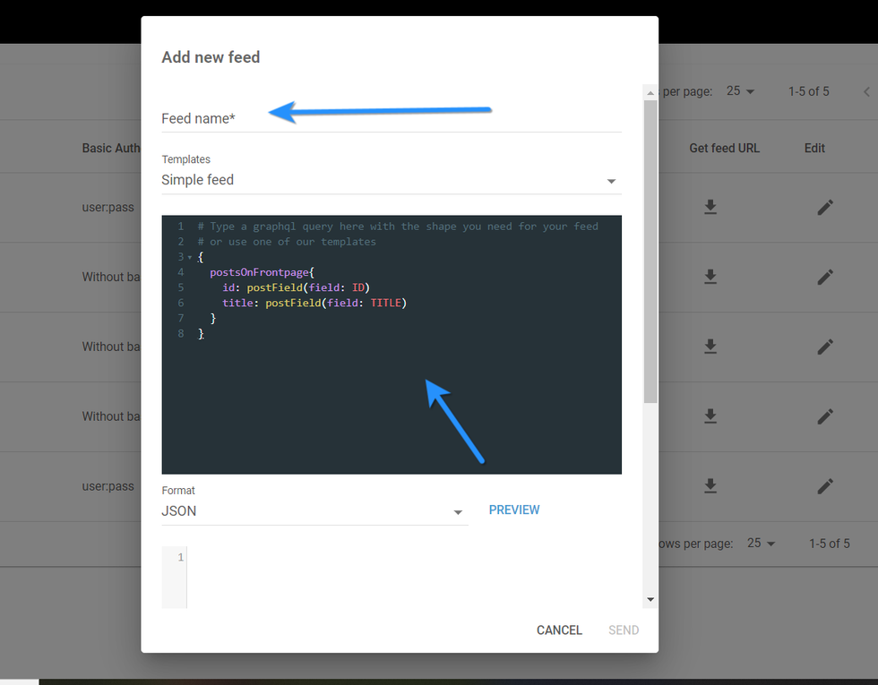 To add a new feed, click the ⨁ icon in the bottom right-hand corner. From there, you can enter your feed's name, code, and desired template. Within edit mode, you can also add basic access authentication, and even preview the feed before it goes live.
