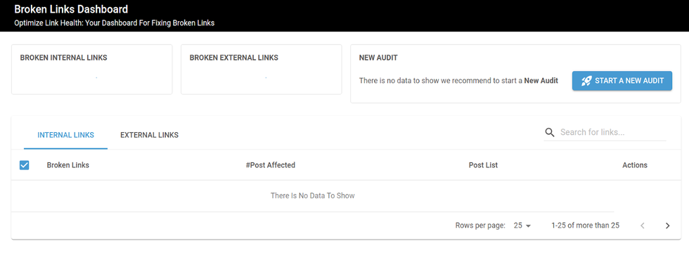 After logging into the Broken Links Dashboard, the first thing you should do is start an audit of your website. This process may take some time to finish because it carefully reviews each post on your website to find broken links. You can also periodically start new audits to ensure that your site's health is continuously monitored and maintained.