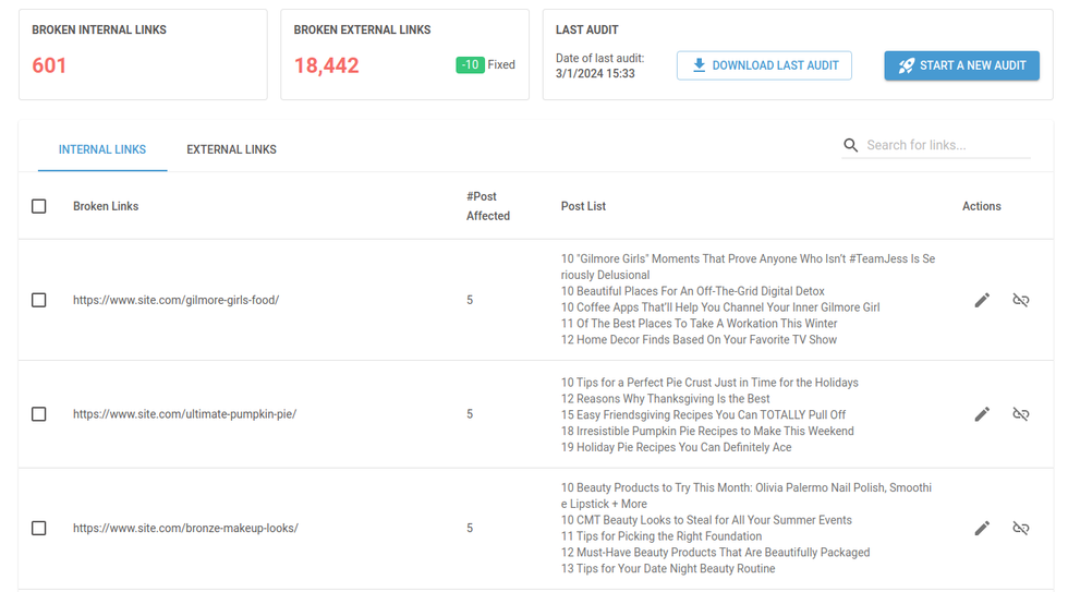 Manually Edit Links: To manually edit links, simply click the edit/pencil icon next to any identified broken link and make your changes. Every post containing that link will be automatically updated with the new one, ensuring a smooth and efficient update process.