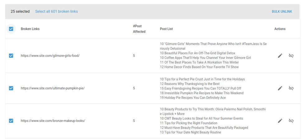 Bulk or Single Unlink Links: The bulk unlink feature removes several broken links from original posts, addressing multiple issues. We recommend this option for websites that have a large number of broken links. Remember that having no link is better than having a broken link.