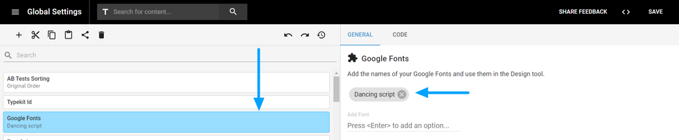 Simply type the name of your preferred font and add it. Once added, the font name automatically converts to the font style you've chosen so you can see exactly how it will look.
