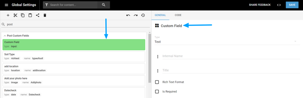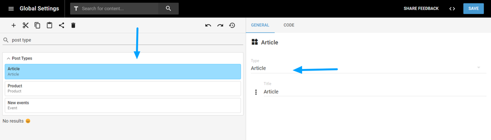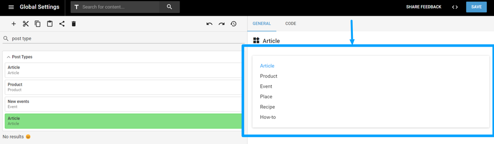 There are 6 different types of posts: Article, Product, Event, Place, Recipe, How-To. You can select them from the Type dropdown menu.