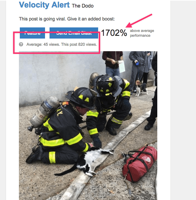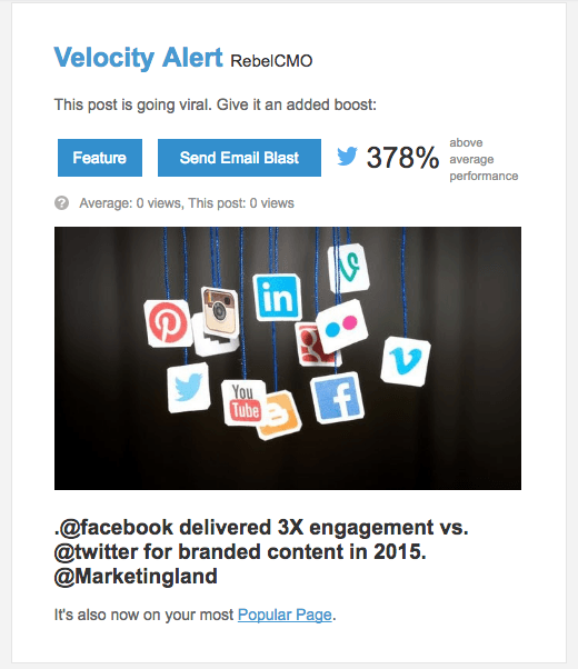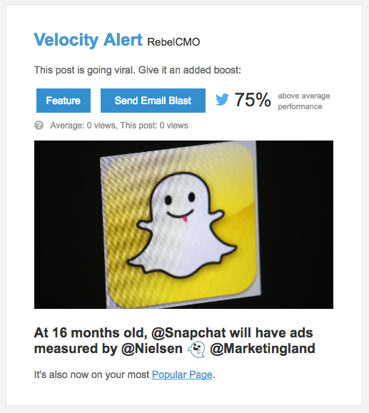 This is where Velocity Alerts, unique to our platform, come into play. With Velocity Alerts, your team is notified when a post starts to trend so you can "add fuel to the fire" by featuring the post more prominently on your site, triggering newsletter alerts, and/or promoting on social.