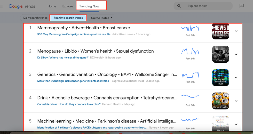 One of the best features of Google Trends is that it shows you topics that are trending in real time. By analyzing what topics are creating a buzz, you can create content that is relevant and timely for your audience — hopefully capturing their interest before your competition does.