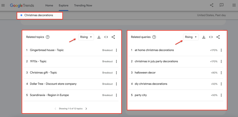 Example: If you’re writing about Christmas decorations, entering “Christmas decorations” into Google Trends might show related queries like “at home Christmas decorations,” “Christmas in July decorations,” and “DIY Christmas decorations.” These would all be great ideas for new pieces of content.