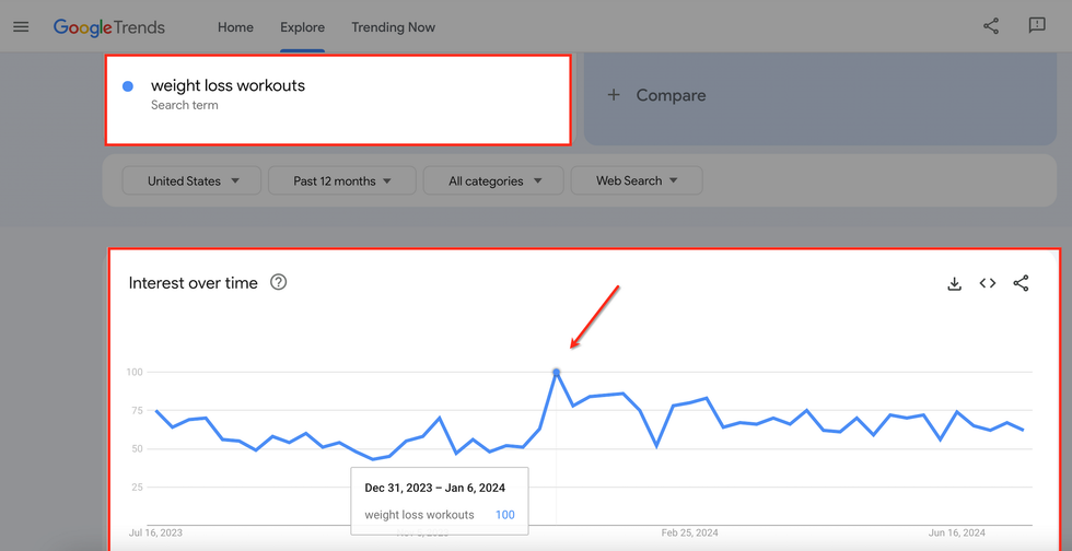 Example: If you create content around fitness, you may see a spike in “weight loss workouts” at the beginning of the year when people make New Year’s resolutions. You can plan for this spike in interest and make sure your content is ready to fire when the time is right.