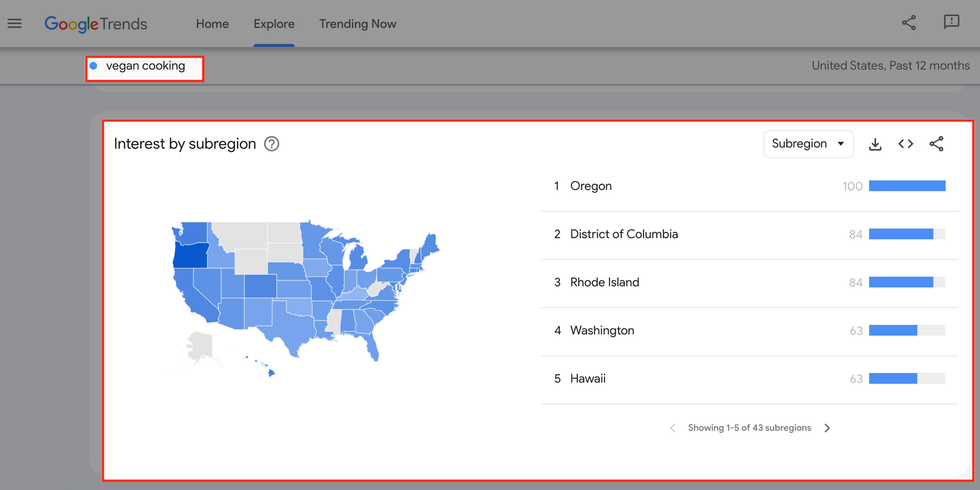 Example: If you create content about food, you may realize that searches for “vegan cooking” is particularly high in certain states or countries, so you can create content about vegan cooking that caters to those specific areas. For instance, if “vegan cooking” searches are high in Oregon, you could create a post about “The Best Vegan Cooking Classes in Oregon.”