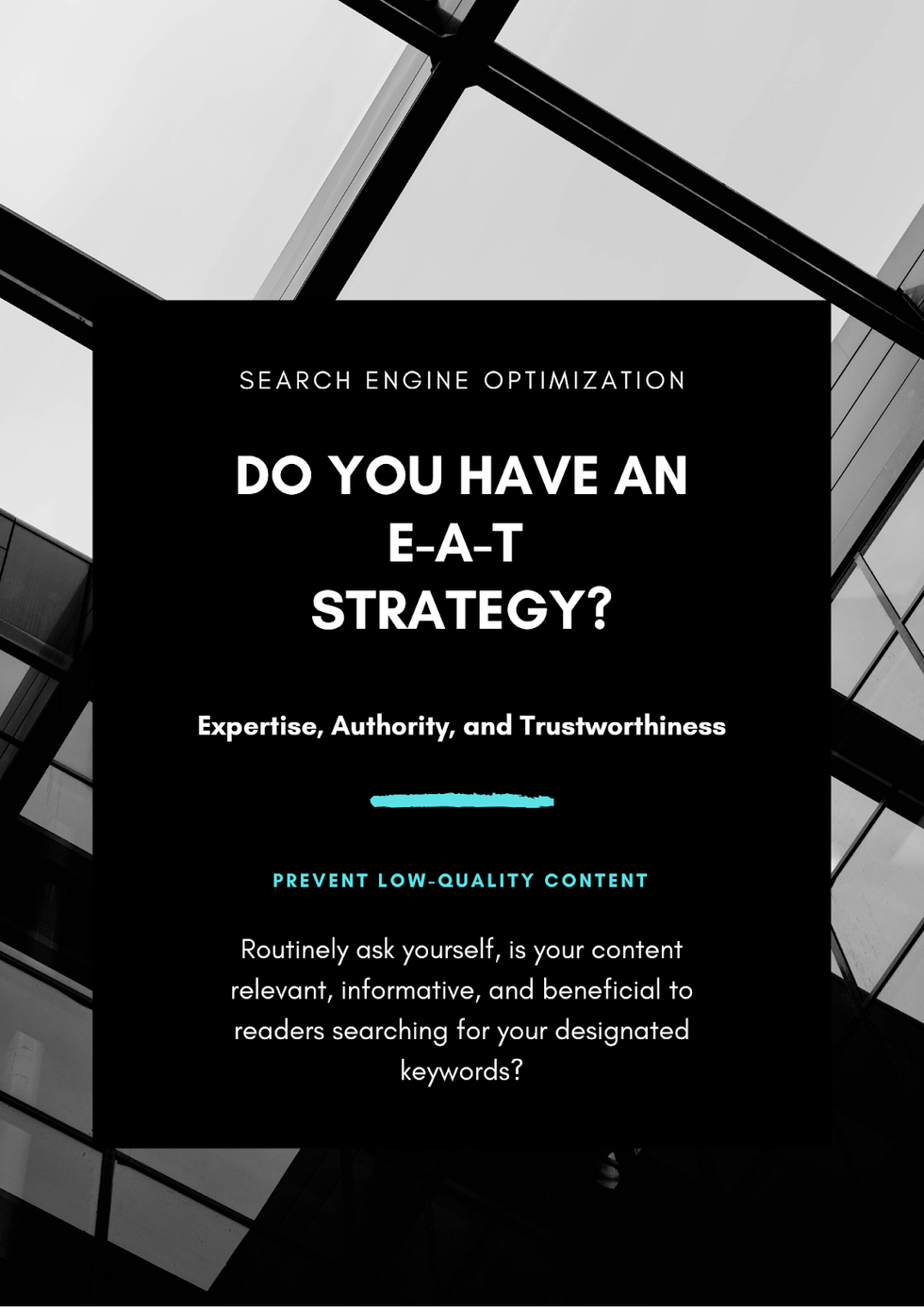 E-A-T stands for expertise, authority, and trust. In short, it means your content should claim ultimate jurisdiction over your topic so that readers won't need to look anywhere else to feel satisfied with their search query.