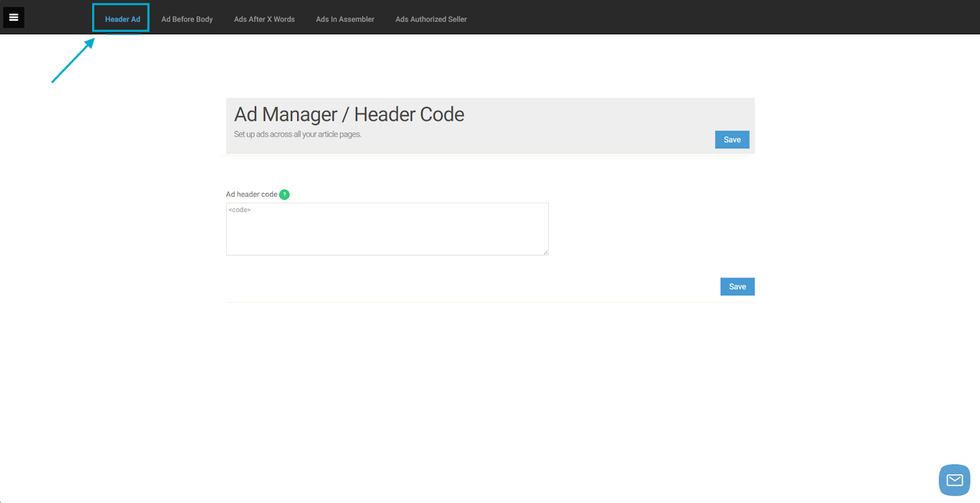 Your ad network will provide a header code to place within the tag to run your ads. This code can be inserted in the Header Ad section, which will apply the ad placement across your entire site in the header element.