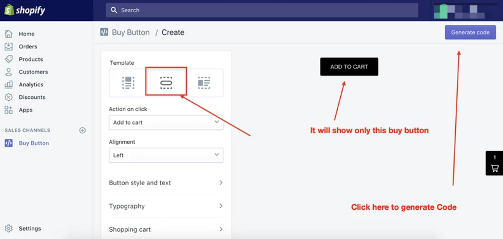 - Make sure you choose the small Buy Button template and then click on Generate code.