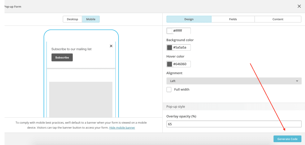 When you're happy with how your pop-up looks, click the Generate Code button in the bottom-righthand corner.