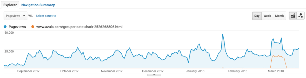 True to what's expected, Azula has experienced a number of peaks and valleys over the past seven months. But as the trendline demonstrates, the majority of their valleys have settled at an elevation far above where they were when they started out on RebelMouse. That's the result of a loyal, growing audience consuming content on a 24/7 basis — not only when a grouper swallows a shark in one bite.
