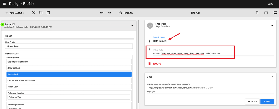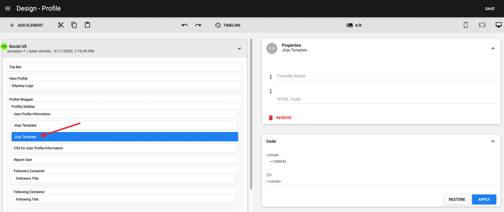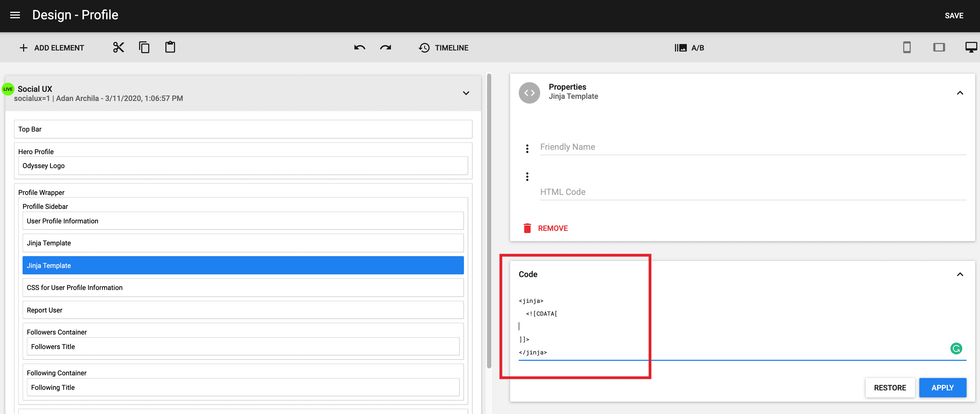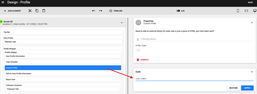 Start by opening the Layout & Design Tool, navigate to your Profile Page, add a Custom HTML element to the layout, and then open the Code view.